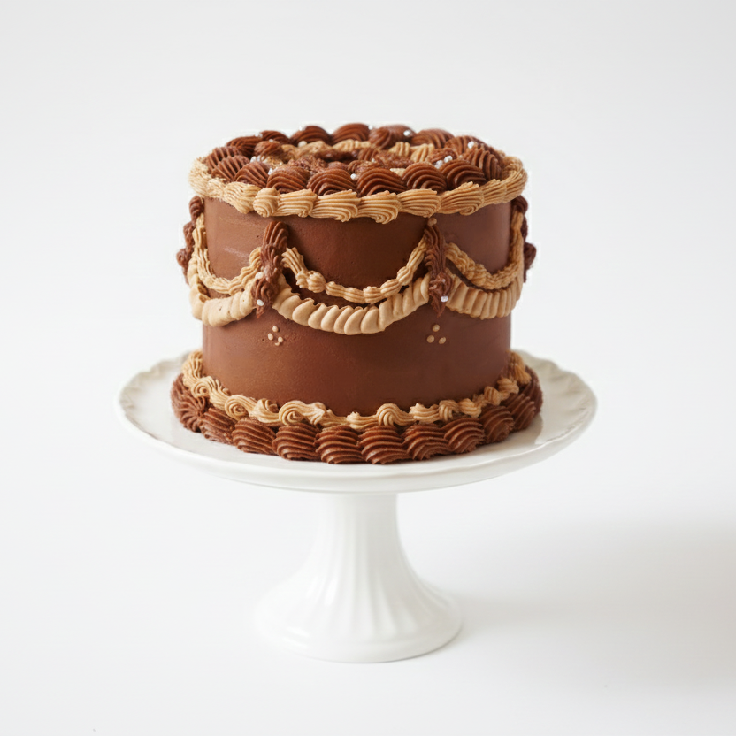 An elegant 8-inch, three-layer vintage-style chocolate cake adorned with intricate hand-piped buttercream detailing, with fully customizable flavours inside.