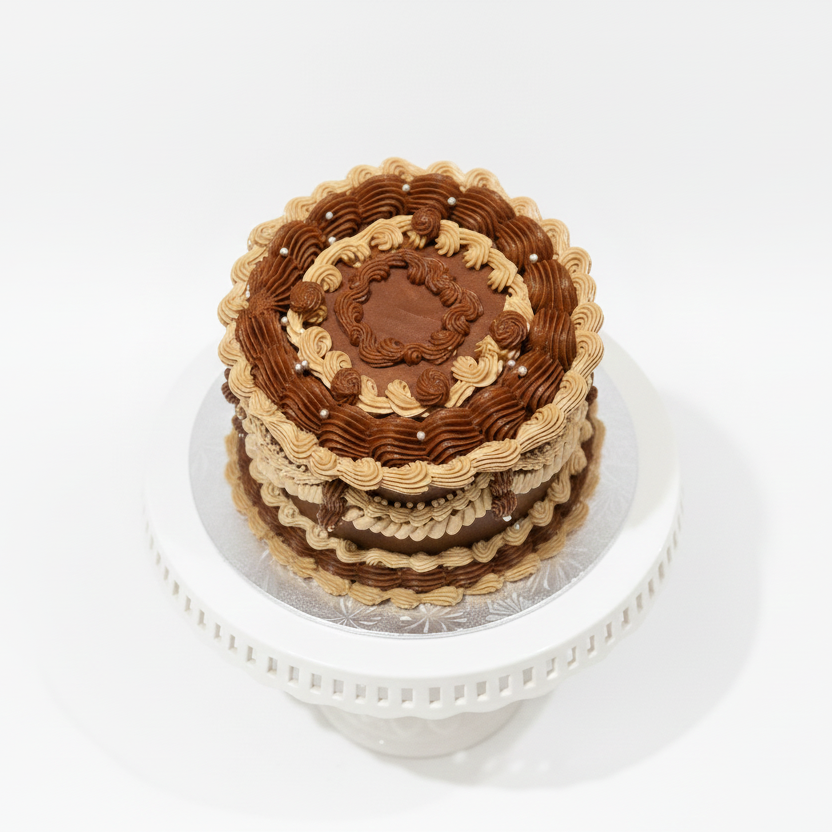 This Vintage Chocolate Lambeth Cake is a refined classic with rich, old-world charm. Styled in deep chocolate and caramel-toned buttercream, the cake features intricate hand-piped swags, layered borders, scalloped detailing, and subtle pearl accents, creating an elegant, heirloom-inspired design perfect for birthdays, anniversaries, and sophisticated celebrations.