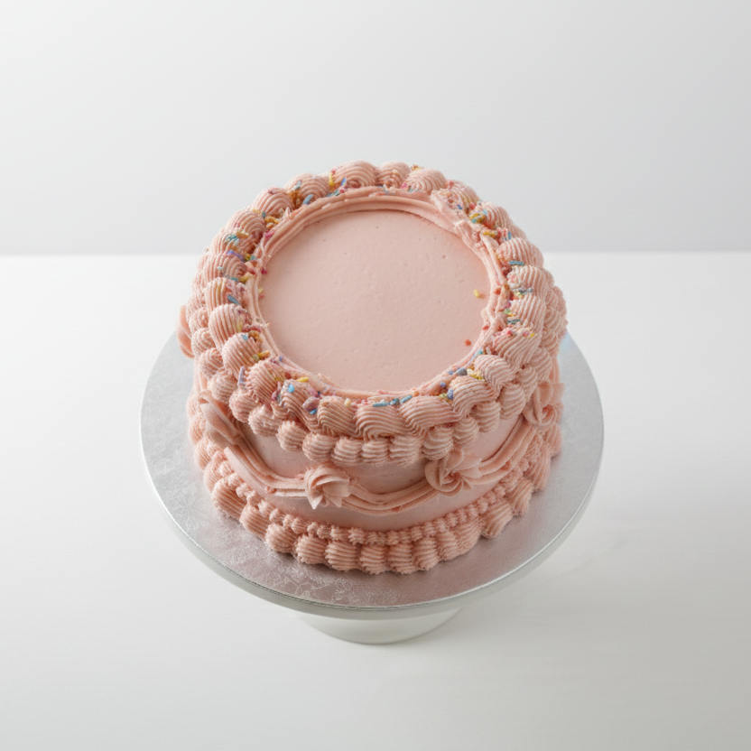 This cake has 3 layers of moist chocolate cake layered with strawberry buttercream and strawberry jam between the layers. Cake is covered in strawberry buttercream, topped with birthday sprinkles and decorated in vintage style.